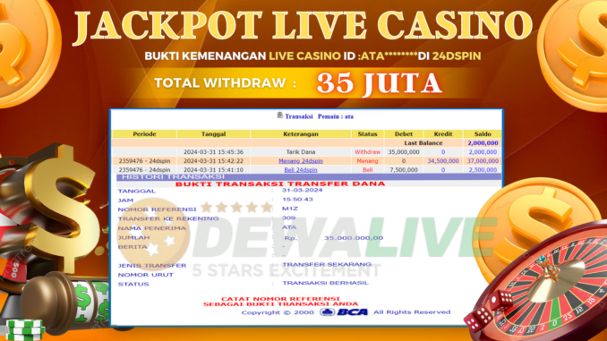 DEWALIVE JACKPOT LIVE CASINO DI 24D SPIN Rp 35.000.000,- LUNAS