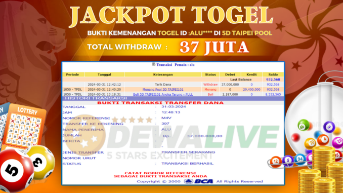 MEMBER DEWALIVE MENERIMA PELUNASAN JACKPOT TOGEL DI TAIPEI POOL Rp 37.000.000,- LUNAS
