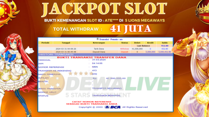 DEWALIVE mengucapkan selamat kepada user id : ATE** yang telah berhasil mendapatkan jackpot pada permainan SLOT DI 5 LIONS MEGAWAYS. Kemenangan sebesar Rp 41.000.000,-. telah dibayarkan LUNAS oleh pihak dewalive kepada pemilik user id setelah yang bersangkutan mengisi formulir withdraw. Proses pencairan dana berlangsung sangat cepat hanya dalam waktu 5-11 menit sudah berada dalam rekening pemilik user id.
