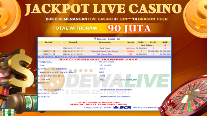 DEWALIVE mengucapkan selamat kepada user id : JUN** yang telah berhasil mendapatkan jackpot pada permainan LIVE CASINO DI DRAGON TIGER. Kemenangan sebesar Rp 90.000.000,-. telah dibayarkan LUNAS oleh pihak dewalive kepada pemilik user id setelah yang bersangkutan mengisi formulir withdraw. Proses pencairan dana berlangsung sangat cepat hanya dalam waktu 5-11 menit sudah berada dalam rekening pemilik user id.