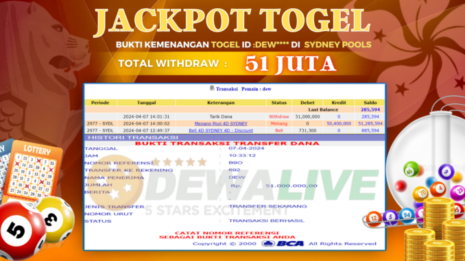 DEWALIVE JACKPOT TOGEL DI SYDNEY POOLS Rp 51.000.000,- LUNAS