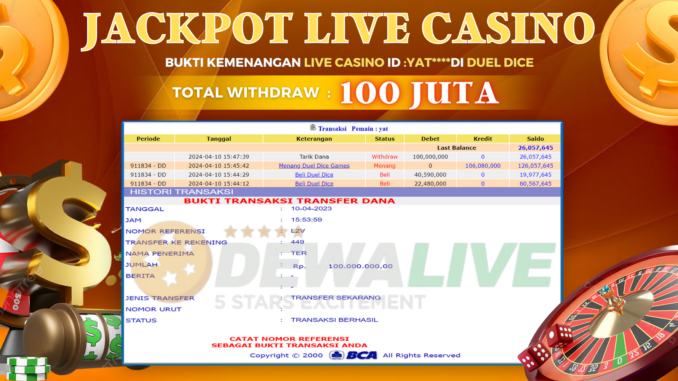 DEWALIVE mengucapkan selamat kepada user id : YAT** yang telah berhasil mendapatkan jackpot pada permainan LIVE CASINO DI DUEL DICE. Kemenangan sebesar Rp 100.000.000,-. telah dibayarkan LUNAS oleh pihak dewalive kepada pemilik user id setelah yang bersangkutan mengisi formulir withdraw. Proses pencairan dana berlangsung sangat cepat hanya dalam waktu 5-11 menit sudah berada dalam rekening pemilik user id.