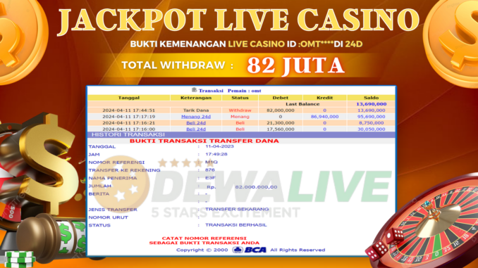 DEWALIVE JACKPOT LIVE CASINO DI 24D Rp 82.000.000,- LUNAS
