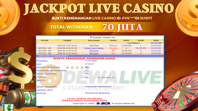 DEWALIVE mengucapkan selamat kepada user id : FVK** yang telah berhasil mendapatkan jackpot pada permainan LIVE CASINO DI SUWIT. Kemenangan sebesar Rp 70.000.000,-. telah dibayarkan LUNAS oleh pihak dewalive kepada pemilik user id setelah yang bersangkutan mengisi formulir withdraw. Proses pencairan dana berlangsung sangat cepat hanya dalam waktu 5-11 menit sudah berada dalam rekening pemilik user id.