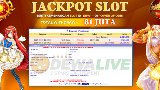 DEWALIVE JACKPOT SLOT DI POWER OF ODIN Rp 81.000.000,- LUNAS