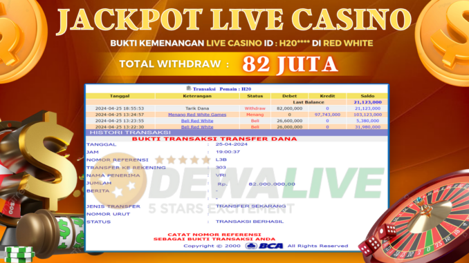 DEWALIVE JACKPOT LIVE CASINO DI RED WHITE Rp 82.000.000,- LUNAS