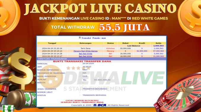 MEMBER DEWALIVE MENERIMA PELUNASAN KEMENANGAN JACKPOT LIVE CASINO DI RED WHITE GAMES Rp 55.500.000,- LUNAS