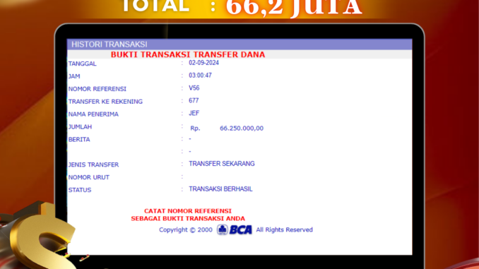 Bukti transfer yang dapat anda lihat adalah bukti SAH / VALID yang langsung di dapatkan melalui bukti transaksi dari Bank yang digunakan untuk pengiriman dana pada rekening pemilik user id. Terima kasih kami sampaikan kepada para pengguna setia DEWALIVE yang telah menggunakan situs kami, sebagai Bandar Terpercaya yang pastinya membayar semua kemenangan member hingga lunas. Apakah DEWALIVE PENIPU ? Reputasi “DEWALIVE TERPERCAYA” sudah sangat melekat.